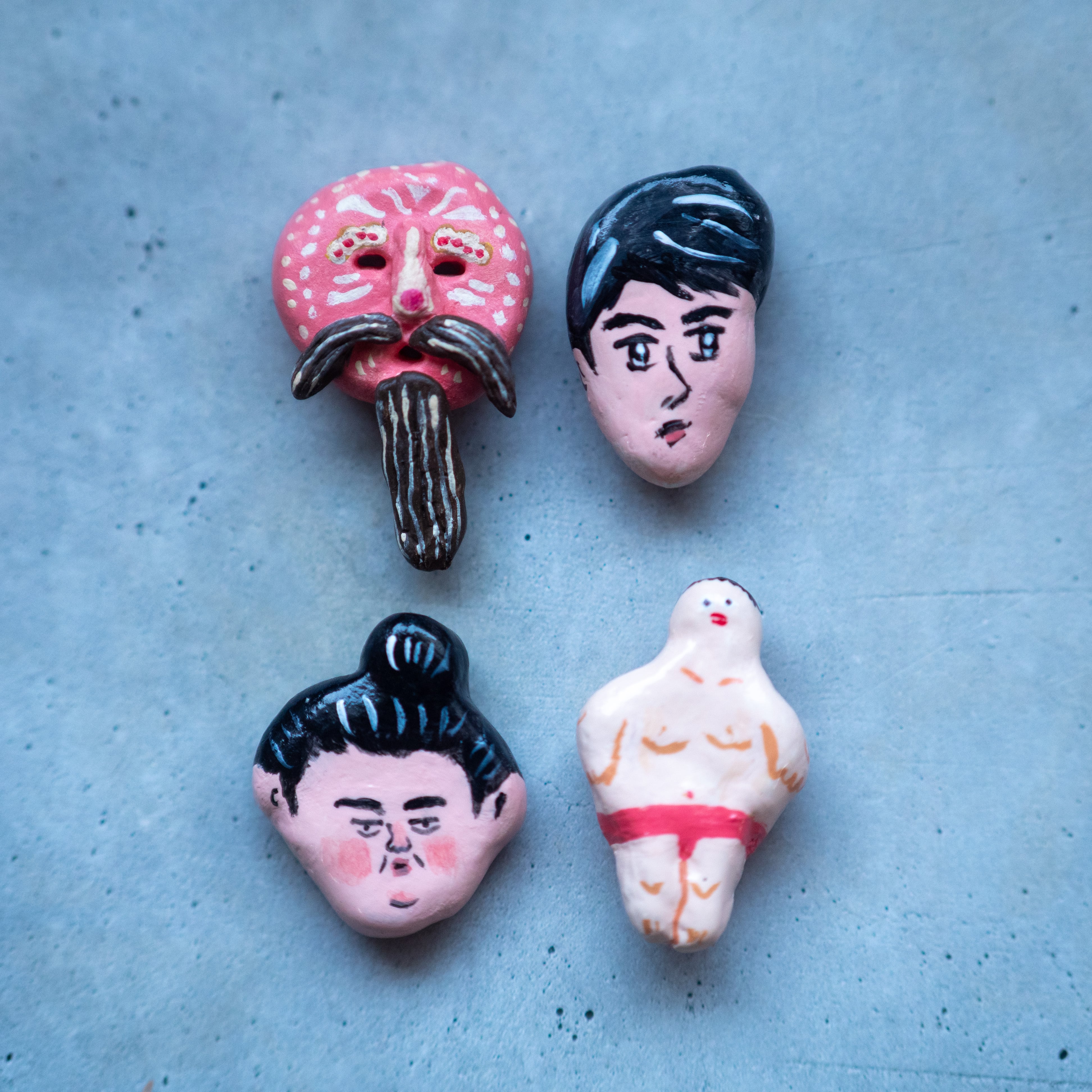 デスク周りに冷蔵庫に、かわいくシュールなマグネットで個性的に彩ろう♡ 素材:石塑粘土、アクリル、ニス